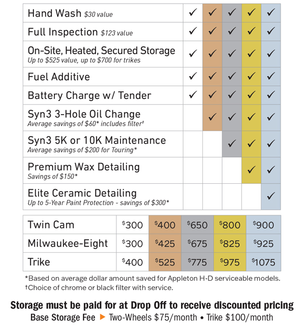 At Appleton Harley-Davidson®, we offer a basic motorcycle storage rate of $75/month for two-wheel bikes and $100/month for trikes, but you can opt for one of our 2025-2026 motorcycle storage packages for added services such as routine maintenance, washes, and detailing. All you need to do is select your package, drop off your bike, and we'll take care of the rest!